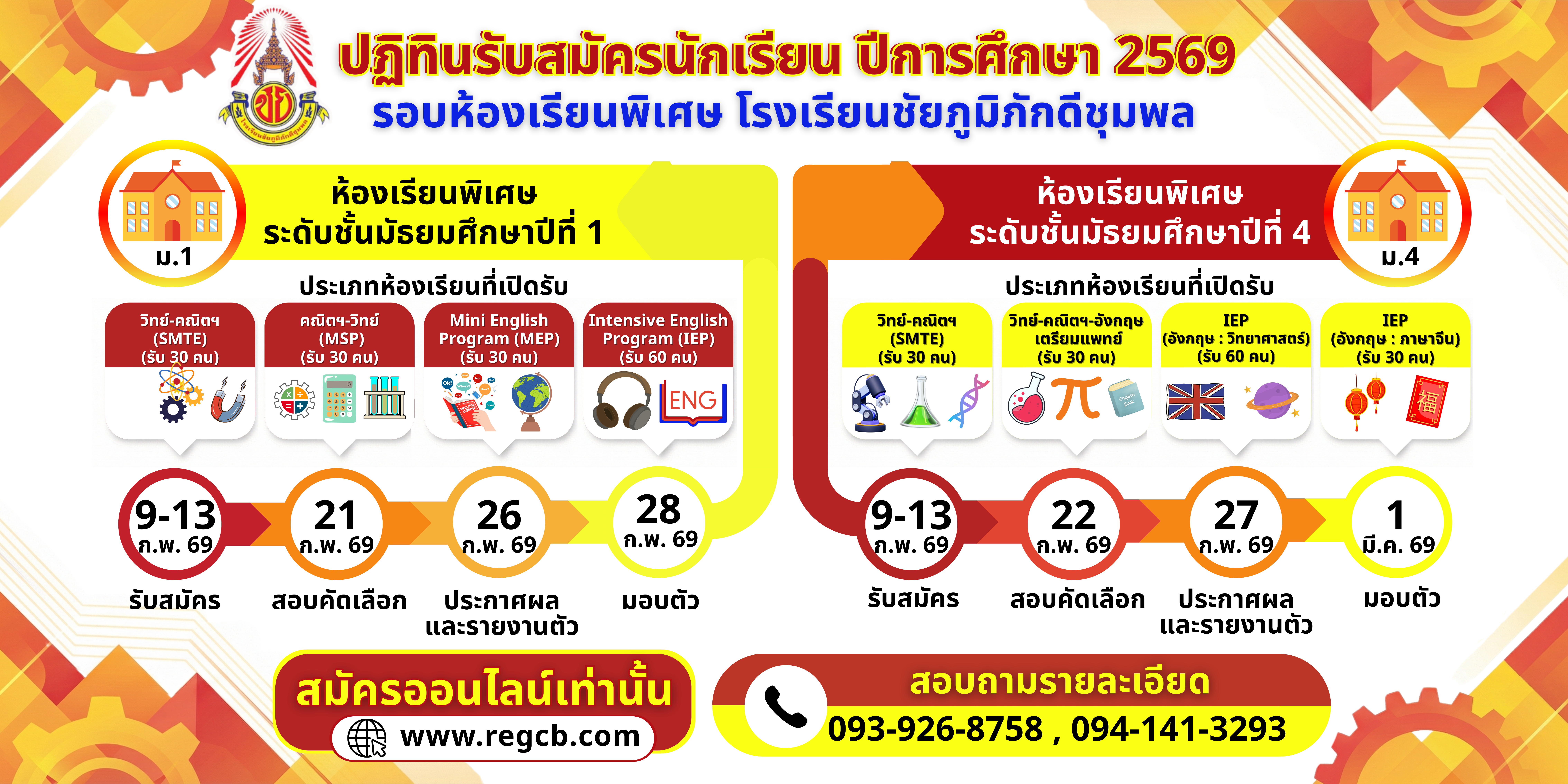 - ประกาศโรงเรียนชัยภูมิภักดีชุมพล เรื่อง การรับนักเรียนชั้นมัธยมศึกษาปีที่ 3 โรงเรียนชัยภูมิภักดีชุมพล(ม.3) เดิม เข้าศึกษาต่อชั้นมัธยมศึกษาปีที่ 4 ประจำปีการศึกษา 2569